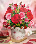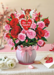 This beautiful medley of roses and snapdragons is complete with a romantic cupid motif!